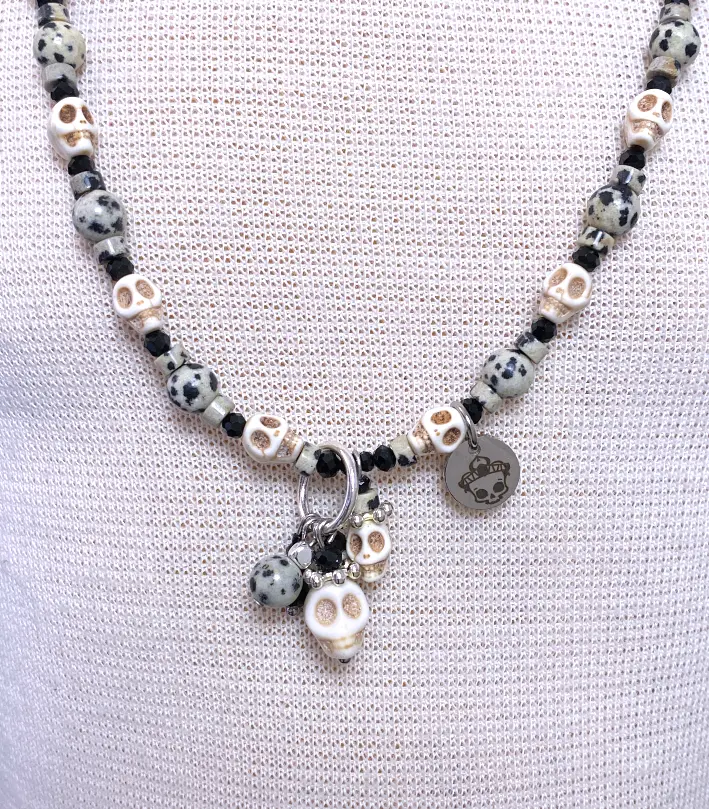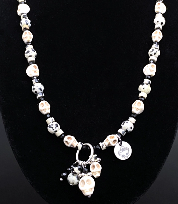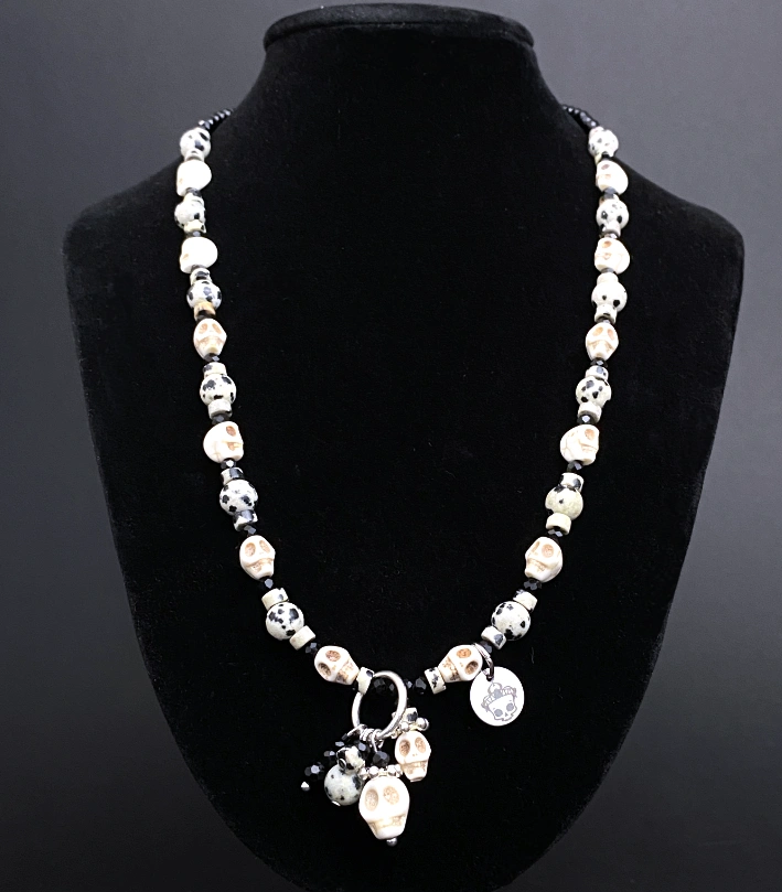 El Collar y Pulsera Artesanal Calaveras y Piedras de Princesa de Roca Negra es el set de accesorios ideal para quienes buscan un estilo atrevido y diferente. Combina calaveras talladas en tono marfil con piedras moteadas que transmiten fuerza y personalidad. Su dije central un anillo grande con colgantes de calaveras en diferentes tamaños, piedras y cristales facetados se convierte en el foco de atención, aportando un estilo irreverente y único.