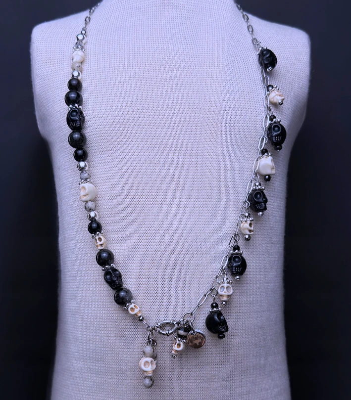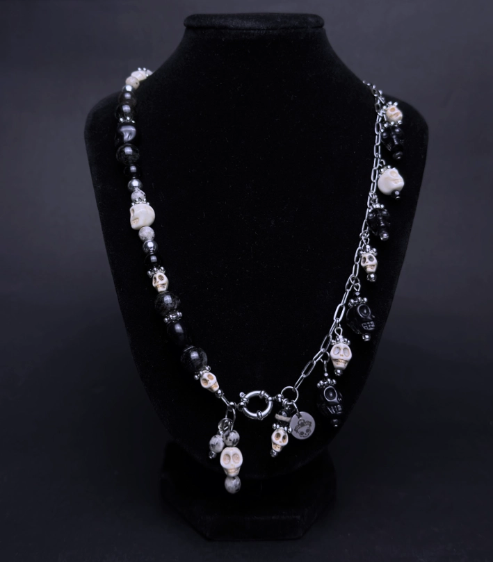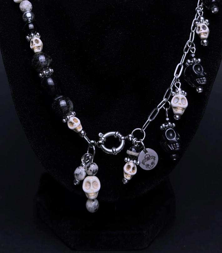 El Collar y Pulsera Artesanal Caveiras Pretas e Brancas de Princesa de Roca Negra es un pieza ideal para quienes buscan un estilo atrevido y diferente. Combina calaveras talladas en tono marfil y negro con piedras naturales en negro y moteadas que transmiten fuerza y personalidad. Con dijes colgantes de calaveras en diferentes tamaños, piedras y cristales facetados se convierte en el foco de atención, aportando un estilo irreverente y único. Una pieza que no pasa desapercibida y que puede ser el regalo perfecto para alguien con espíritu rockero y alternativo.