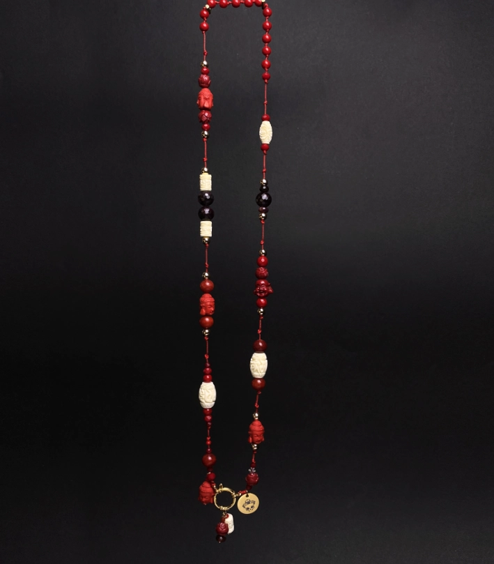 - Cuentas talladas en tonos marfil y flor de loto en rojo intenso.