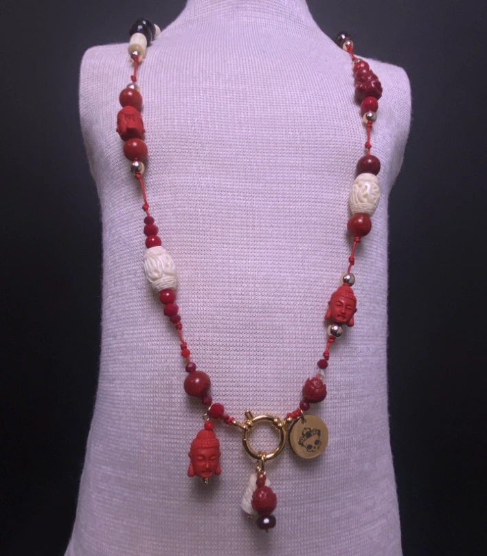 El Collar Artesanal Dinastía de Princesa de Roca Negra combina el carácter atemporal del rojo intenso con la sobriedad de las piezas en marfil, logrando un diseño lleno de contraste y personalidad. Su estilo largo y elegante lo convierte en un accesorio versátil. Mezcla de jade rojo, granate y hueso tallado, con detalles metálicos en acero inoxidable. Ideal como regalo especial por su simbolismo y carácter atemporal.