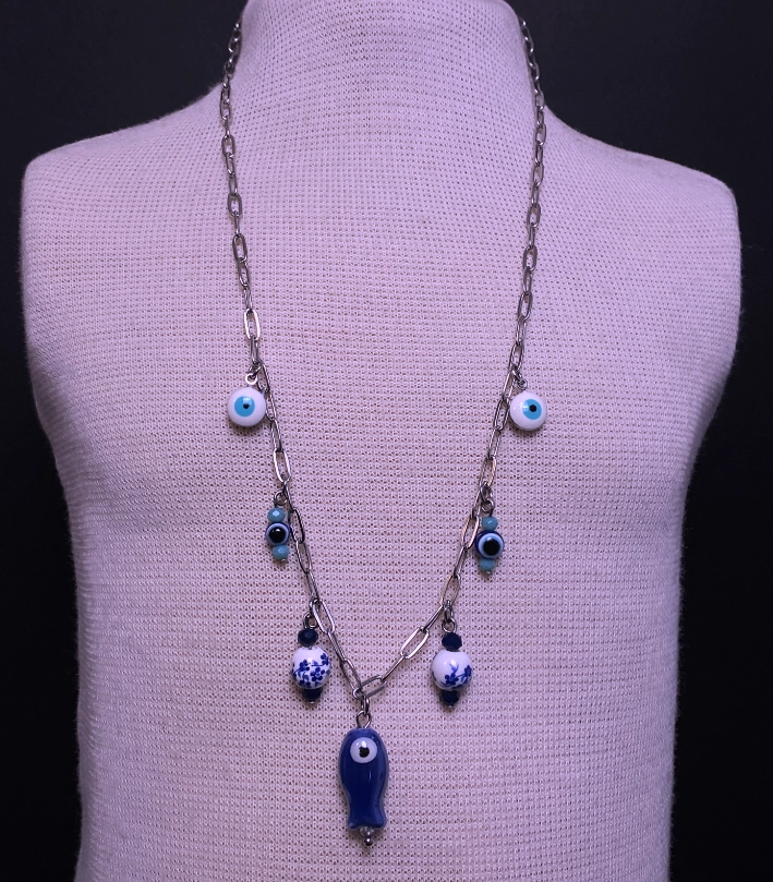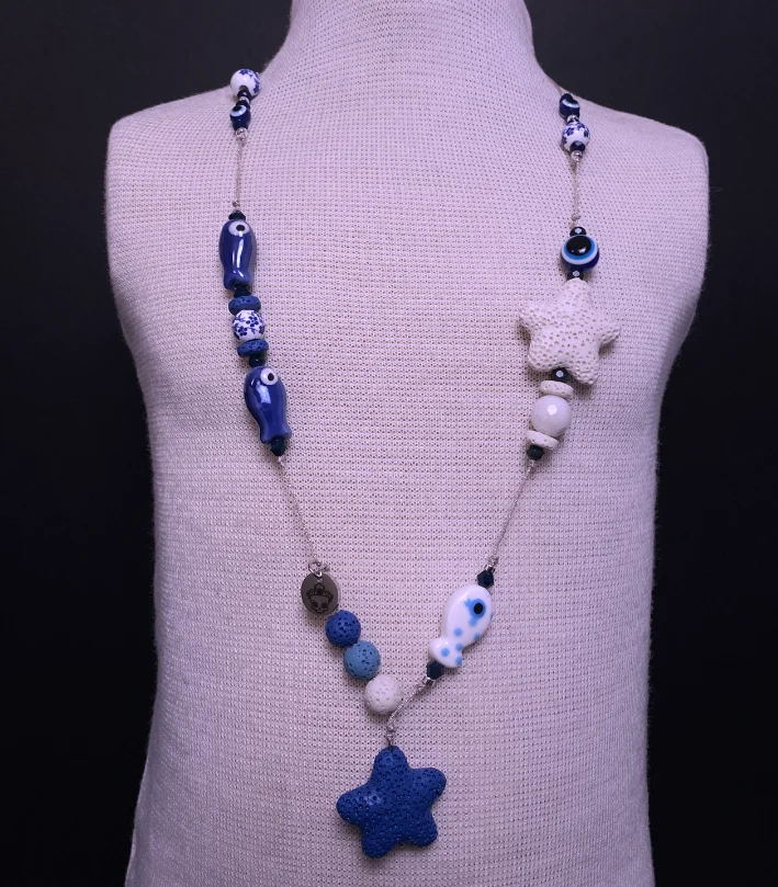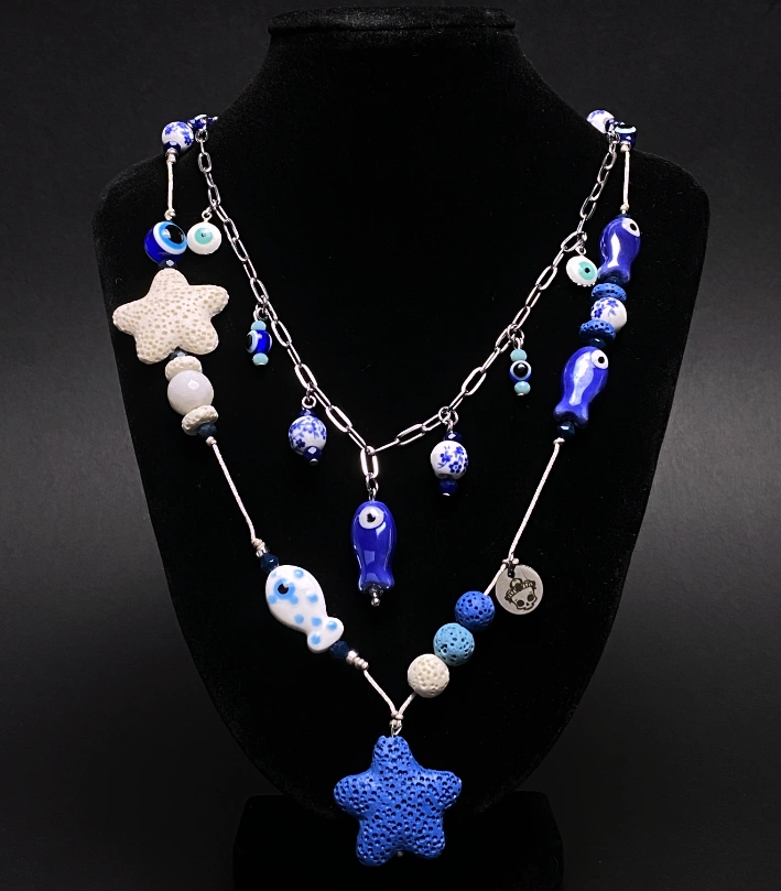 El Collar Artesanal Turquía de Princesa de Roca Negra es una joya inspirada en la tradición mediterránea y el poder protector del ojo turco. Su composición mezcla cuentas en tonos azules y blancos, estrellas marinas en piedra volcánica, peces de cerámica pintados a mano, charms esmaltados con ojos turcos y delicados detalles en vidrio facetado. El dije central en forma de estrella de mar azul otorga fuerza visual al diseño