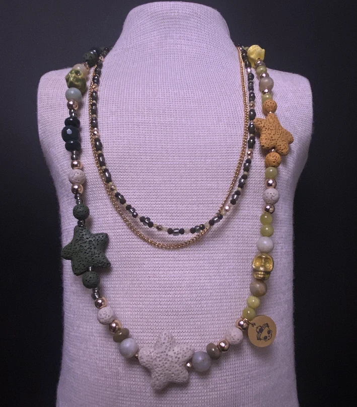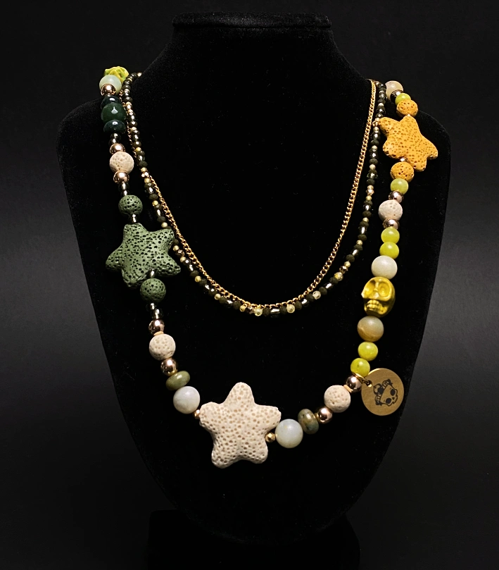 El Collar Artesanal Otoño en el Mar de Princesa de Roca Negra de tres cadenas fusiona la calma marina con los matices cálidos del otoño en una pieza única e irrepetible. Hecho a mano con cierres y componentes de acero inoxidable, piedras naturales, piedra volcánica y cristal, combina texturas y formas que evocan la naturaleza en su estado más puro. Su diseño destaca por grandes estrellas de mar talladas en tonos verde musgo, marfil y amarillo mostaza, intercaladas con cuentas de piedra natural y esferas metálicas doradas.