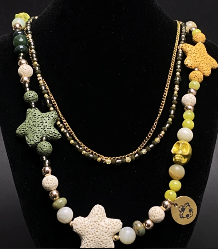 Su diseño destaca por grandes estrellas de mar talladas en tonos verde musgo, marfil y amarillo mostaza, intercaladas con cuentas de piedra natural y esferas metálicas doradas. Una delicada cadena dorada añade un toque extra de elegancia y la belleza de una cadena de distintas cuentas en tonos verdes y dorado permitiendo llevarlo tanto en ocasiones casuales como en eventos especiales. El dije dorado de la marca la convierte en una pieza exclusiva y auténtica, reafirmando la identidad única de Princesa de Roca Negra.