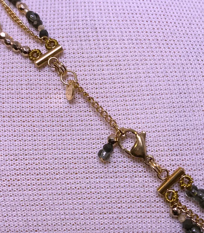 El Collar Artesanal Otoño en el Mar de Princesa de Roca Negra de tres cadenas fusiona la calma marina con los matices cálidos del otoño en una pieza única e irrepetible. Hecho a mano con cierres y componentes de acero inoxidable, piedras naturales, piedra volcánica y cristal, combina texturas y formas que evocan la naturaleza en su estado más puro.