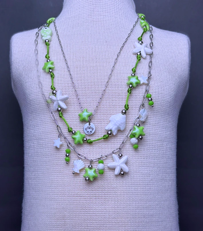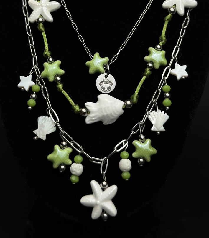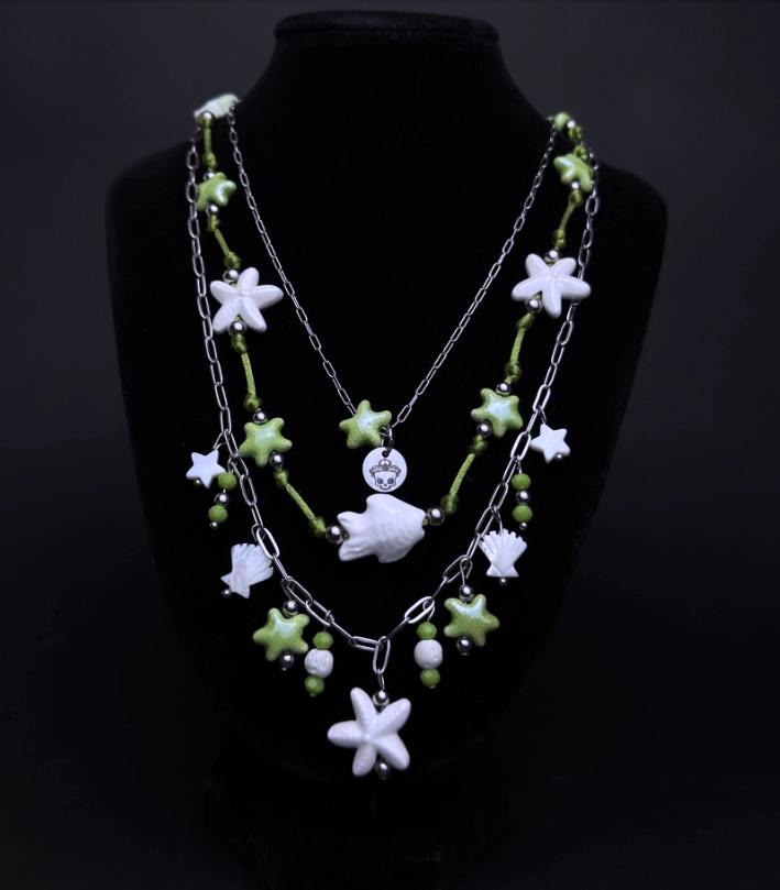 El Collar Artesanal Peixes e Estrelas de Princesa de Roca Negra es una pieza exclusiva inspirada en el encanto marino de Portugal. Hecho a mano con cierres y componentes de acero inoxidable, combina cuentas de cerámica en forma de peces y estrellas marinas de color verde y blanco con conchas de nácar, evocando los paisajes marinos portugueses.Su composición de tres collares, de hilo verde y dos cadenas en diferentes tamaños transmite frescura y elegancia en un diseño único e irrepetible.