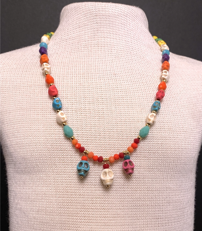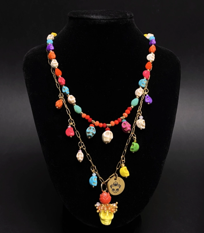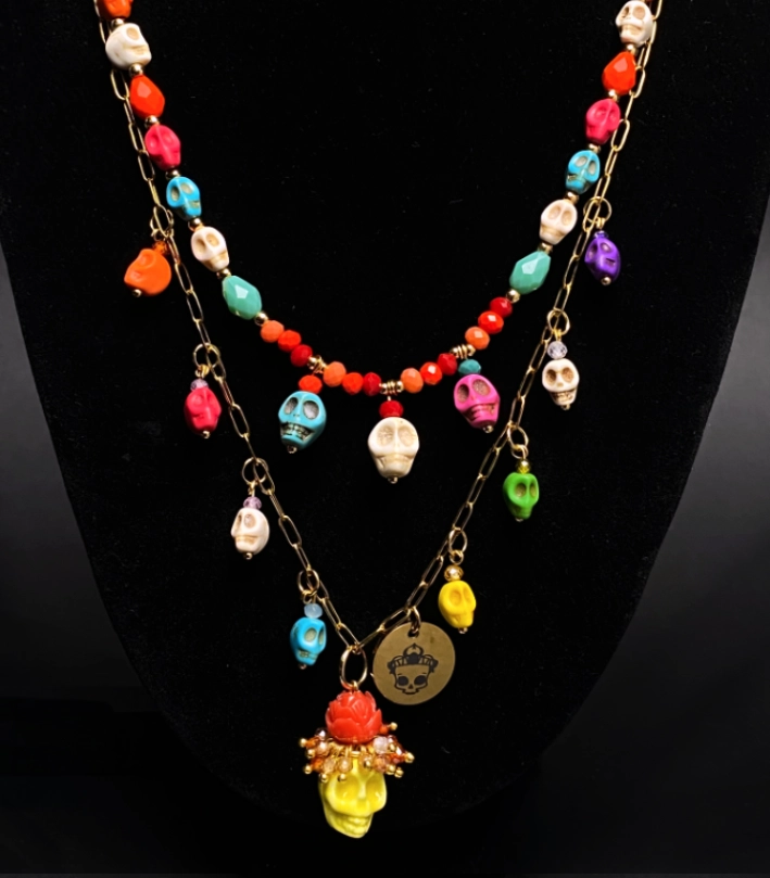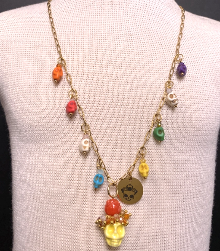 Su composición incluye una alegre variedad de calaveras multicolor en tonos vibrantes como rojo, turquesa, verde, púrpura, naranja y blanco, dispuestas sobre cadena dorada y cuentas facetadas rojas. En el centro, una gran calavera amarilla coronada por un loto rojo y un racimo de cuentas facetadas aporta un toque artesanal inconfundible.