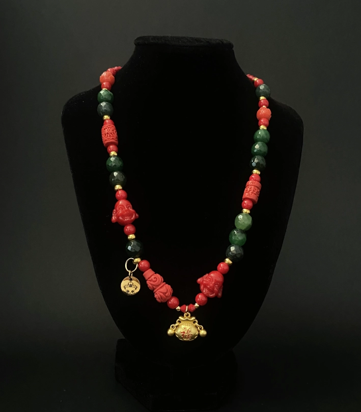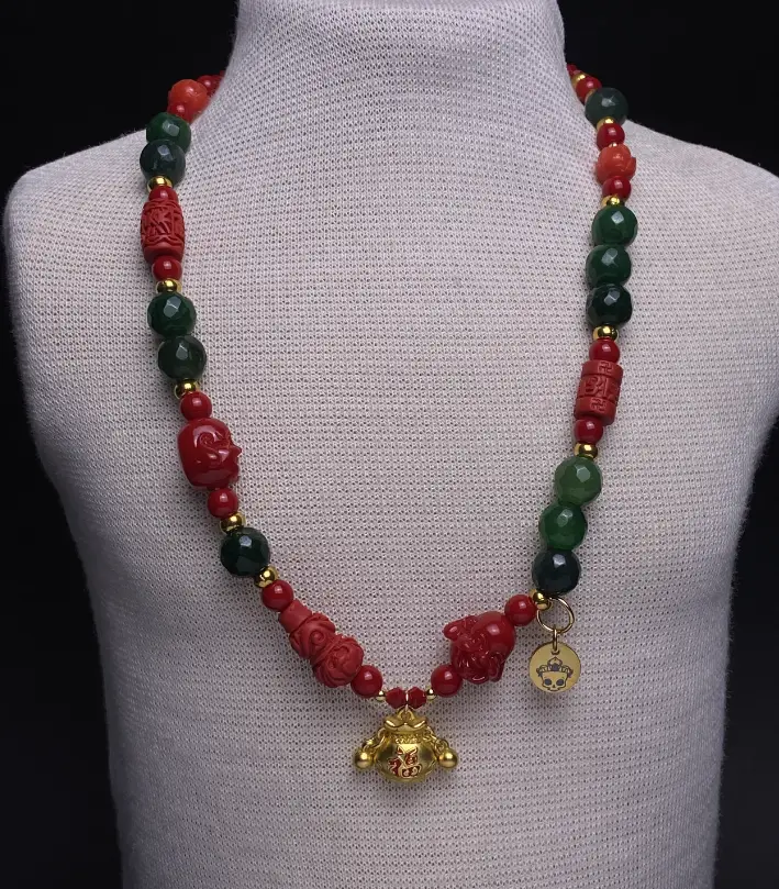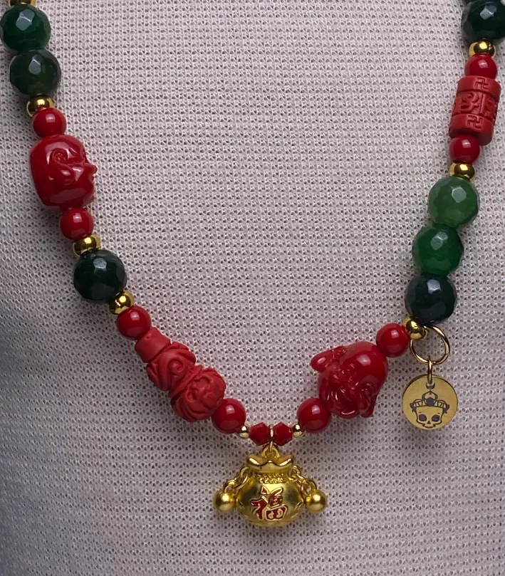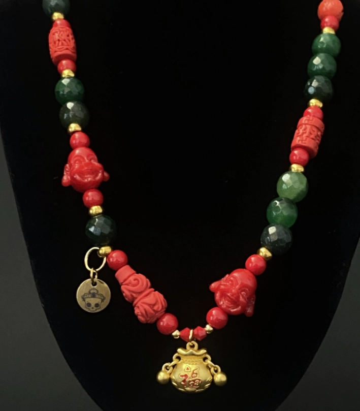 El Collar Artesanal Happy Buda de la Prosperidad de Princesa de Roca Negra es un amuleto de abundancia, alegría y buena fortuna. Su diseño único combina cuentas de piedra natural en tonos verde jade y rojo intenso con figuras talladas del Buda sonriente, símbolo de prosperidad y felicidad.