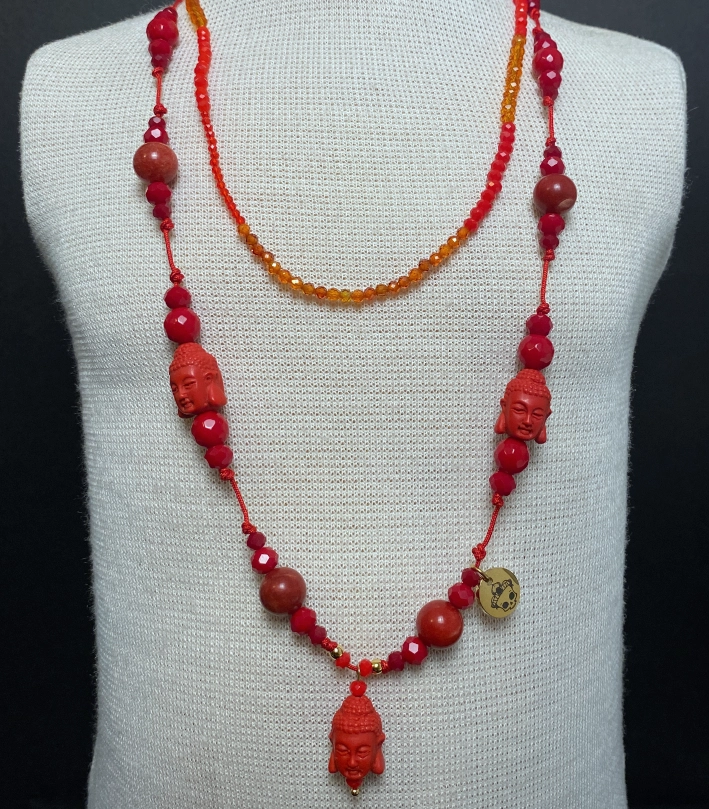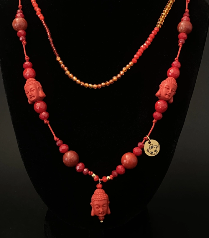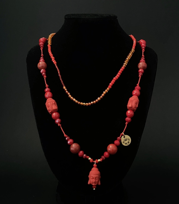 El Collar Artesanal Asia Urbana de Princesa de Roca Negra es una pieza que fusiona la espiritualidad oriental con la modernidad del diseño urbano. Elaborado en tonos intensos de rojo, este collar doble destaca por sus cuentas en diferentes tamaños y texturas, junto con dijes en forma de cabezas de Buda talladas, símbolo de paz, sabiduría y equilibrio.