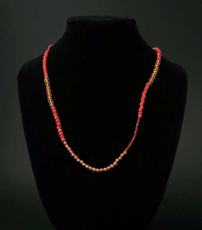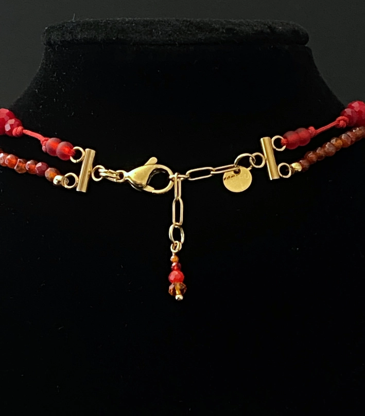 La combinación de cuentas de piedra natural rojas y cuentas de cristal en tonos rojos, naranjas y cuentas doradas dan pequeños destellos de luz y un contraste elegante que convierte a esta pieza en un accesorio poderoso y lleno de energía.El dije dorado de la marca la convierte en una pieza exclusiva y auténtica, sello distintivo de Princesa de Roca Negra.