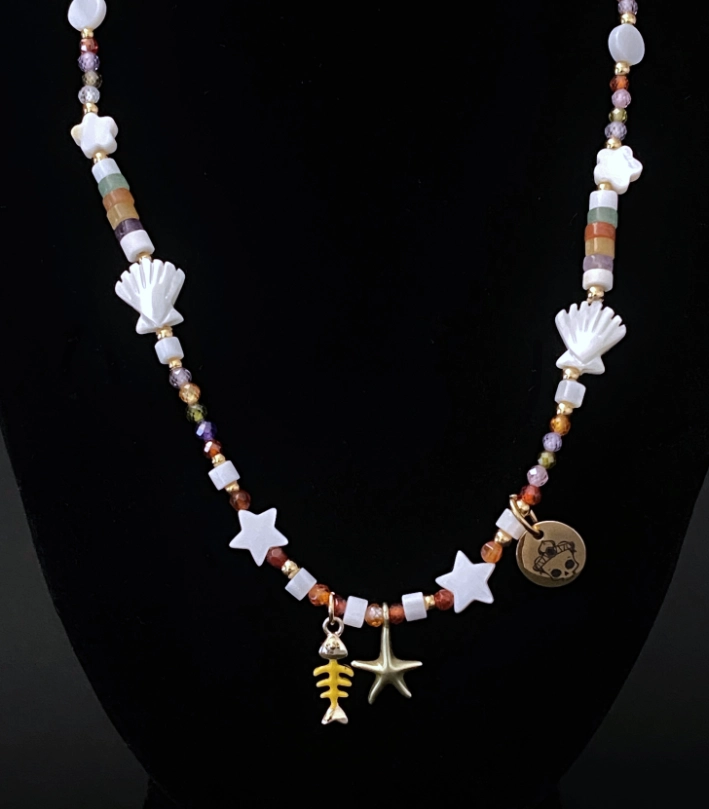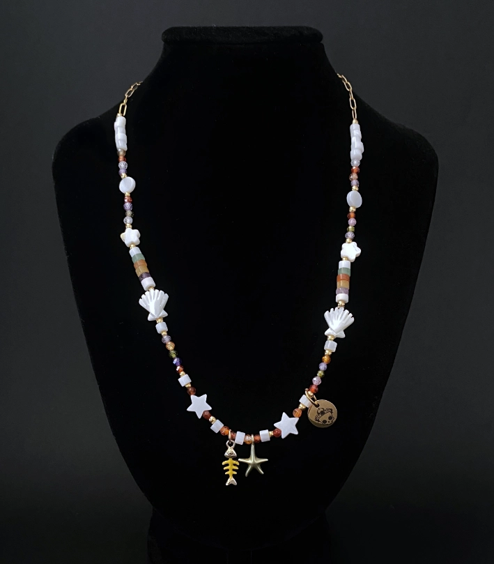 El Set Collar y Pulsera Artesanal Estrella del Mar de Princesa de Roca Negra es un set inspirado en la serenidad y la riqueza del océano. Su diseño combina cuentas multicolor en tonos cálidos y perlados con delicados charms marinos: conchas, estrellas y un dije en forma de espina de pez que evocan la vida marina y la conexión con la naturaleza.