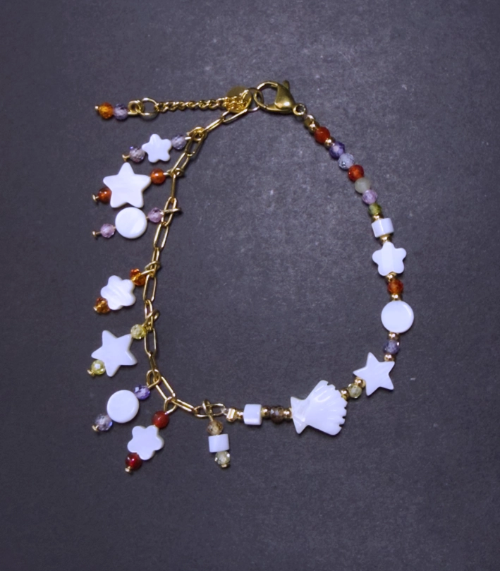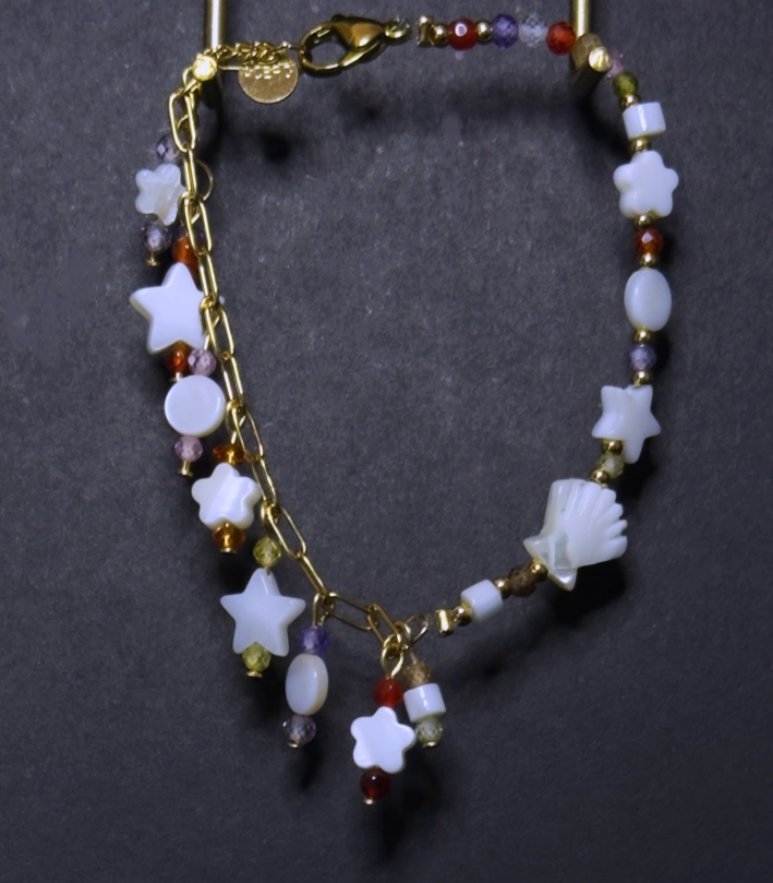 La mezcla de abalorios de vidrio, cerámica y piedra con detalles en acero inoxidable dorado aporta un contraste sofisticado, convirtiéndolo en un accesorio versátil y lleno de frescura.