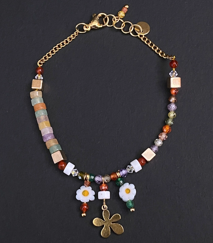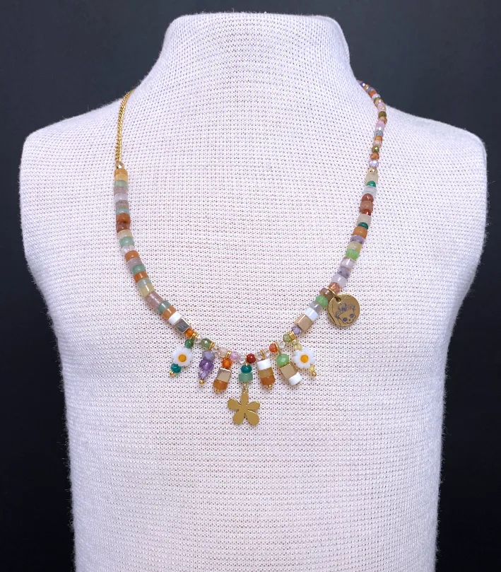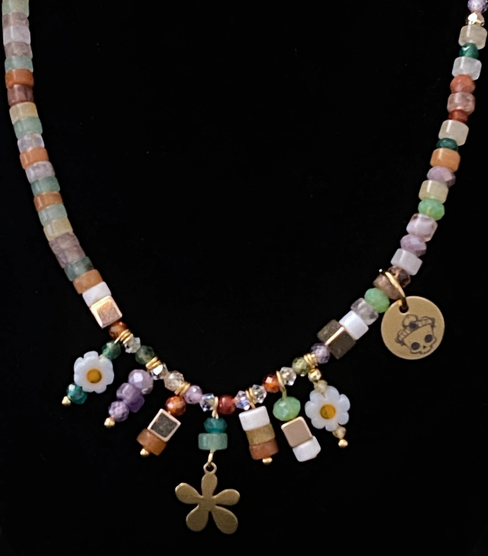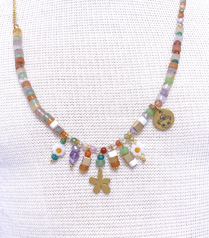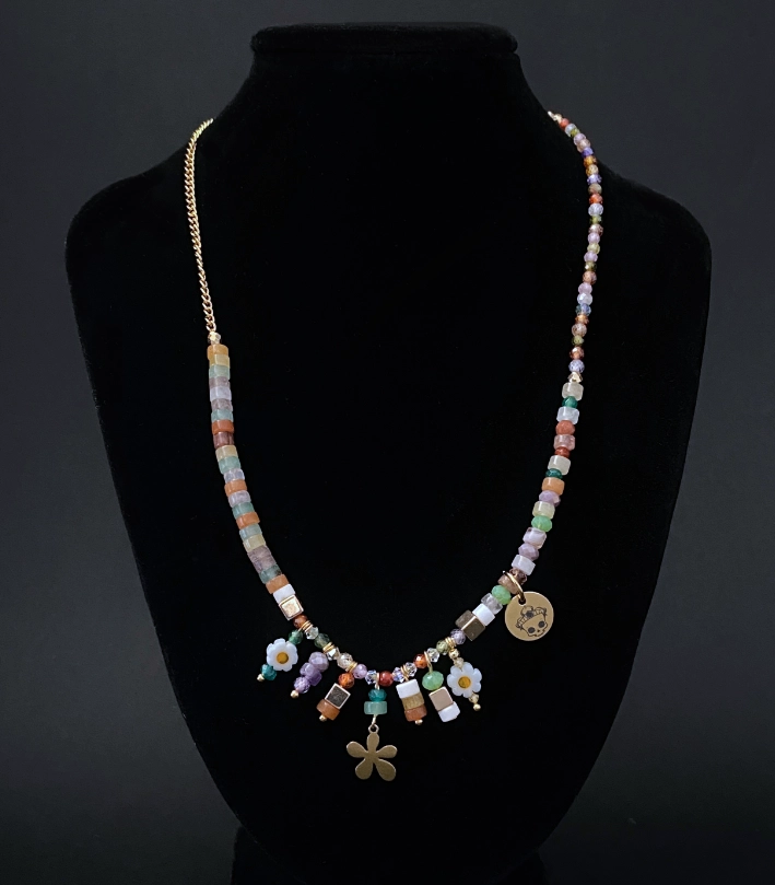 La mezcla de abalorios de vidrio, cerámica y piedra con cadena dorada en acero inoxidable le da un aire sofisticado pero divertido, convirtiendo esta pieza en un accesorio ideal para quienes desean llevar siempre un toque de frescura y optimismo.