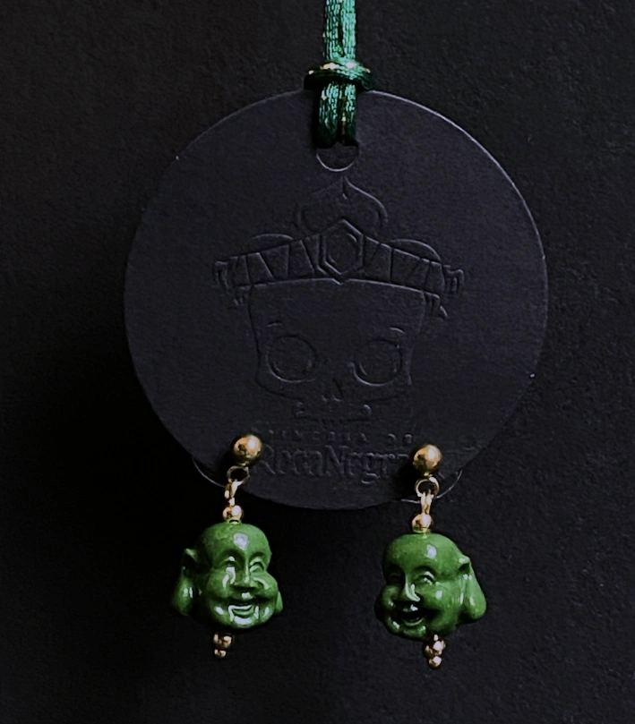 Los Pendientes Buda Feliz de la Fortuna de Princesa de Roca Negra son una joya artesanal pensada para quienes buscan exclusividad y estilo. Su protagonista es un Buda feliz tallado en verde, símbolo de prosperidad y alegría, en combinación cuentas doradas que transmiten riqueza.