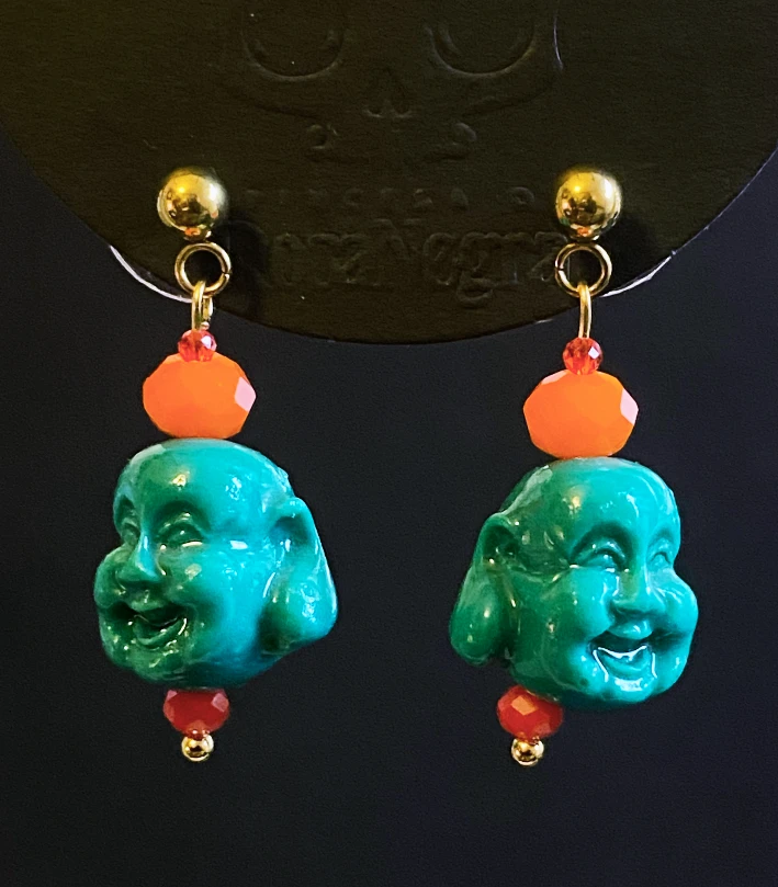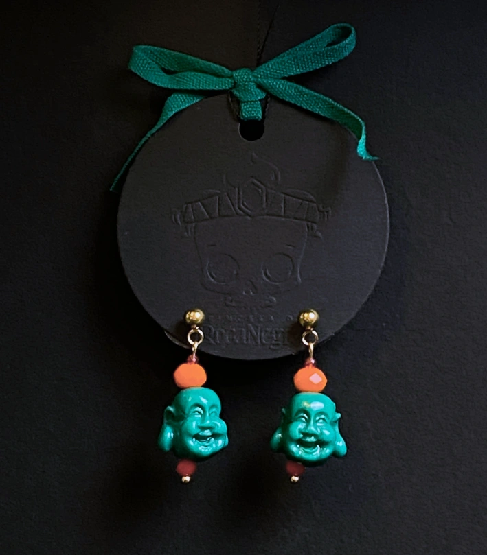 Los Pendientes Artesanales Buda Feliz Verde de Princesa de Roca Negra son una auténtica obra de autor. El contraste del verde vibrante del Buda feliz con las cuentas de cristal facetadas en tonos naranja y coral crea un diseño audaz y llamativo, pensado para quienes no temen destacar.