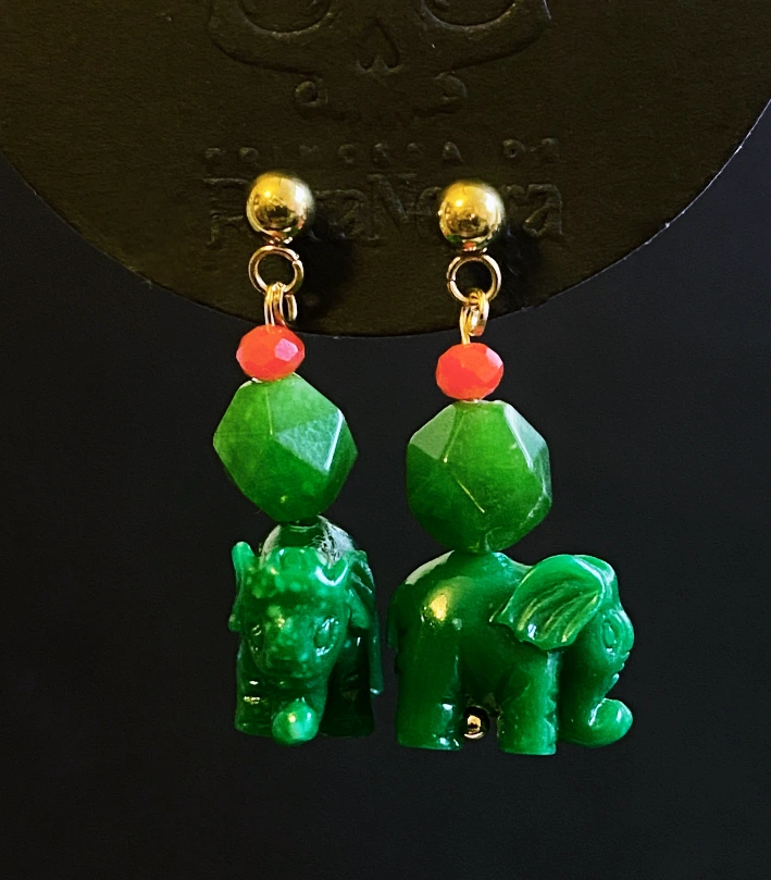 Elefante verde tallado en acrílico, piedras naturales de aventurina verde y cuentas de cristal facetadas en tonos naranja.