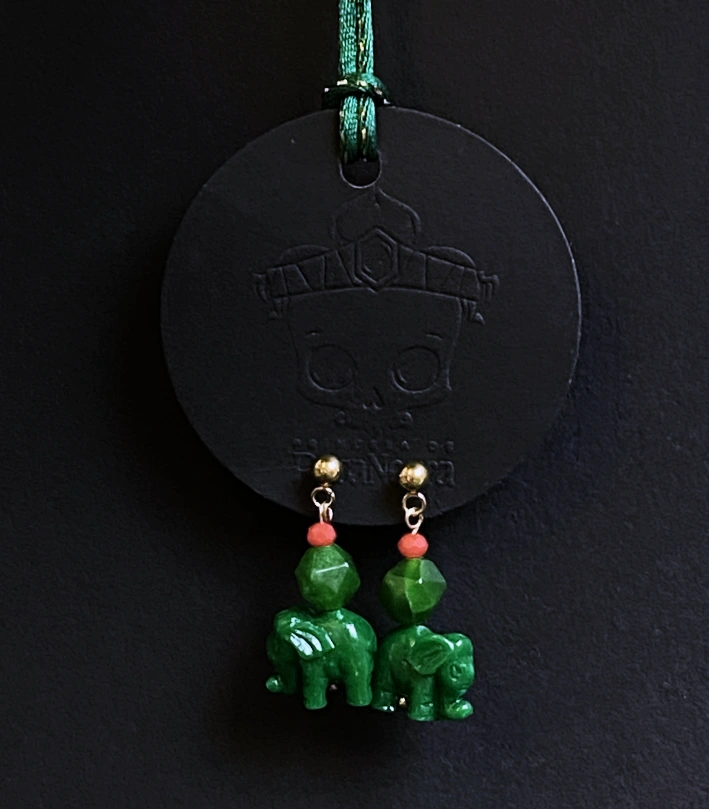 Los Pendientes Artesanales Ganesha de Princesa de Roca Negra son una joya exclusiva que combina artesanía detallada y materiales de alta calidad. Las figuras talladas de elefantes en un profundo verde jade, símbolo de fuerza, protección y buena fortuna, la piedras naturales de aventurina verde combinando el simbolismo con la belleza de la naturaleza.