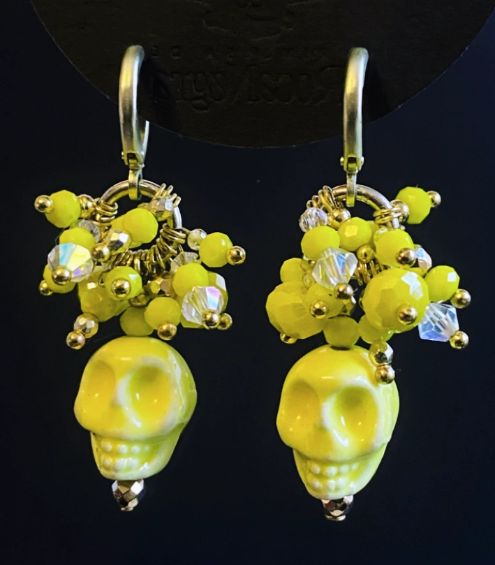 Los Pendientes Artesanales Katrina de Princesa de Roca Negra son una explosión de color y carácter. Su atrevido diseño combina un colgante de calavera de cerámica en amarillo eléctrico con un racimo de cuentas de cristales facetadas y cristales iridiscentes, creando un juego de brillo y movimiento único.