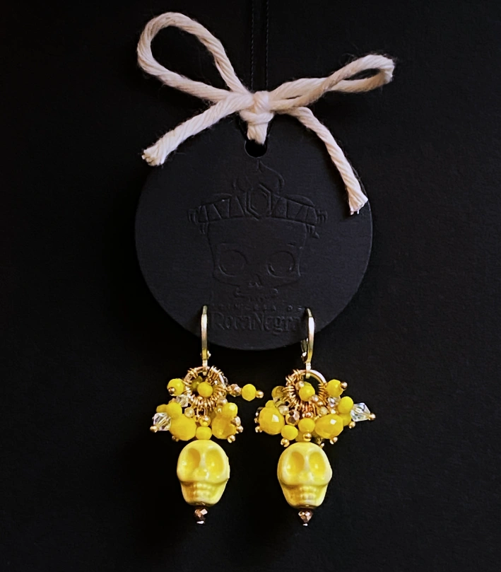 Los Pendientes Artesanales Katrina de Princesa de Roca Negra son una explosión de color y carácter. Su atrevido diseño combina un colgante de calavera de cerámica en amarillo eléctrico con un racimo de cuentas de cristales facetadas y cristales iridiscentes, creando un juego de brillo y movimiento único. Cada par es irrepetible, una joya pensada para quienes no tienen miedo de destacar.