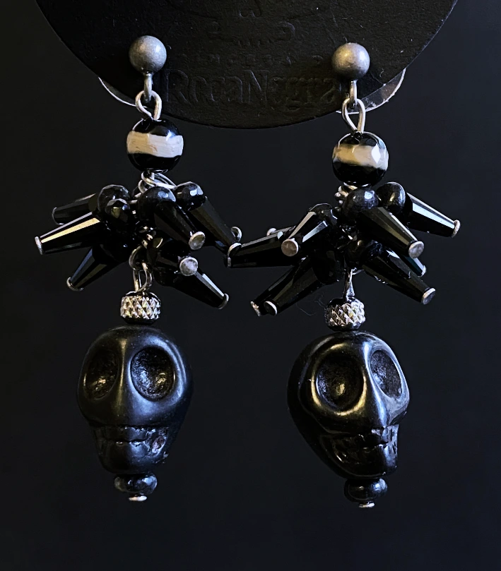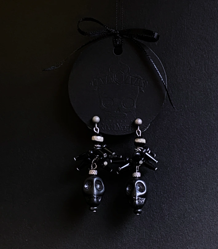 La pieza central de cada pendiente es una calavera tallada en negro colgando de un racimo de espinas de cristales negros, su diseño extravagante y llamativo en la escala de grises hacen que cada par sea único e irrepetible, imposible de encontrar en producciones masivas.