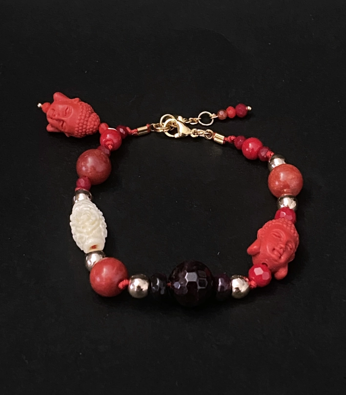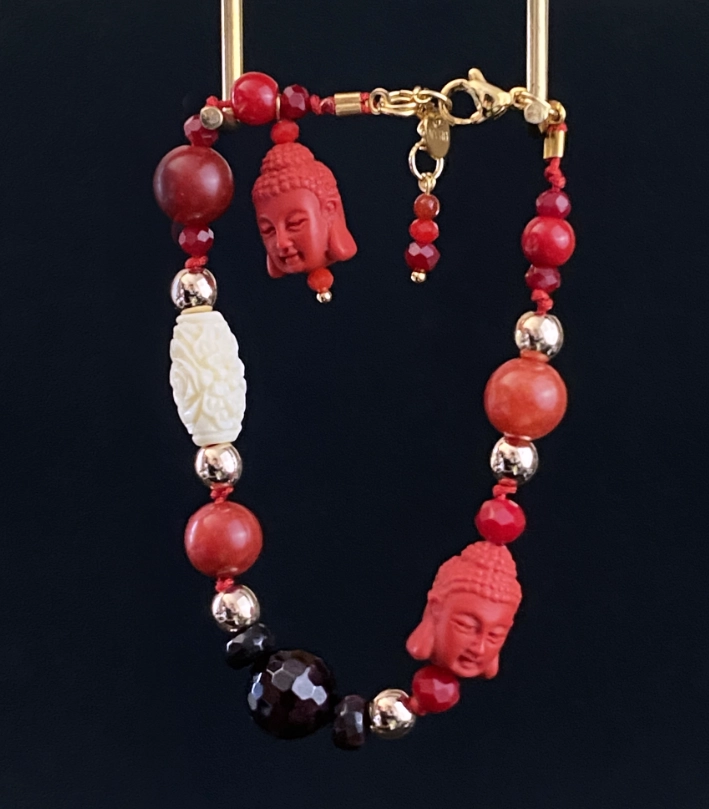 Está elaborada con jaspe rojo y ónix negro, que aporta contraste y profundidad al diseño; y cuentas metálicas doradas que realzan la sofisticación de la pieza. Los dijes tallados en forma de cabezas de Buda en resina artesanal y la cuenta central en marfil sintético trabajado le otorgan un estilo inspirado en las antiguas dinastías asiáticas. Ideal como regalo con personalidad, elegancia y carácter.