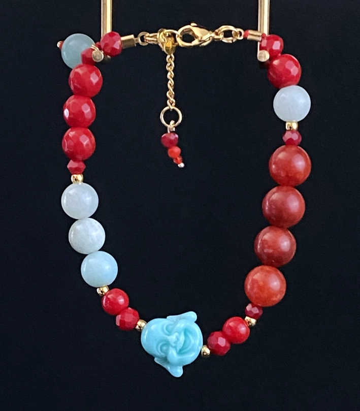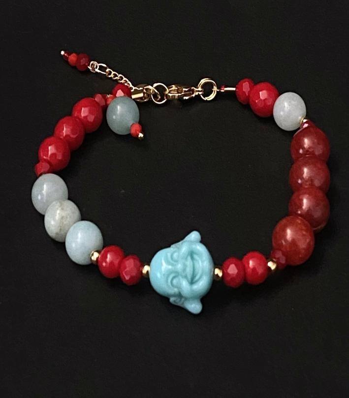 La Pulsera Artesanal Buda Amitayus de Princesa de Roca Negra es una pieza llena de energía y contraste. Su diseño juega con el rojo intenso de las piedras naturales y el azul turquesa del charm central en forma de Buda, logrando un equilibrio entre fuerza y serenidad.