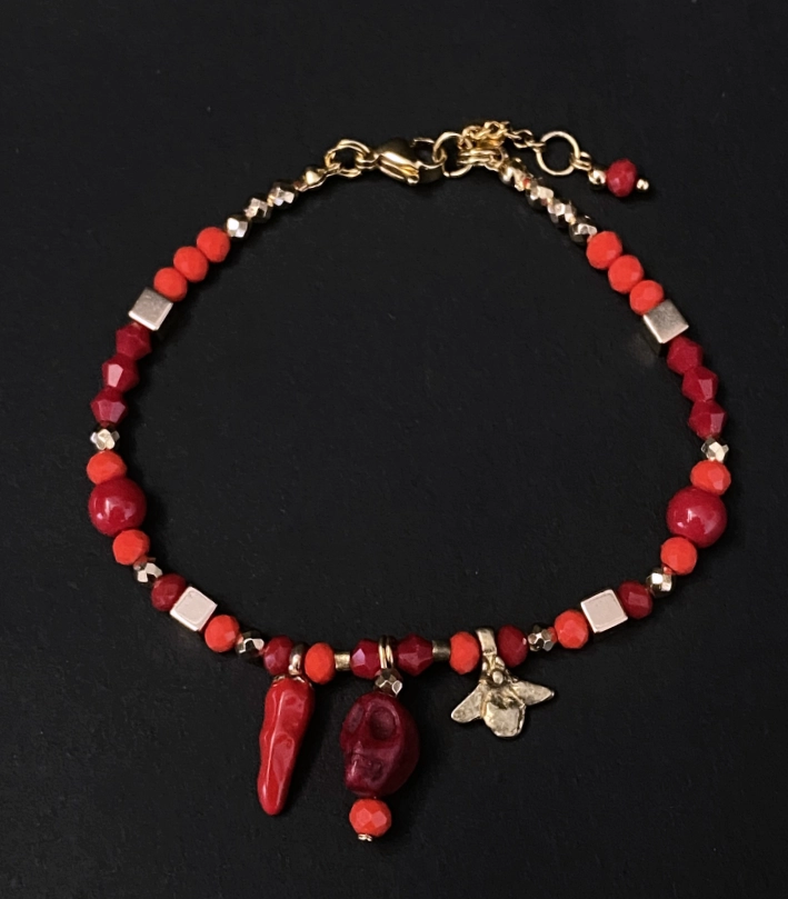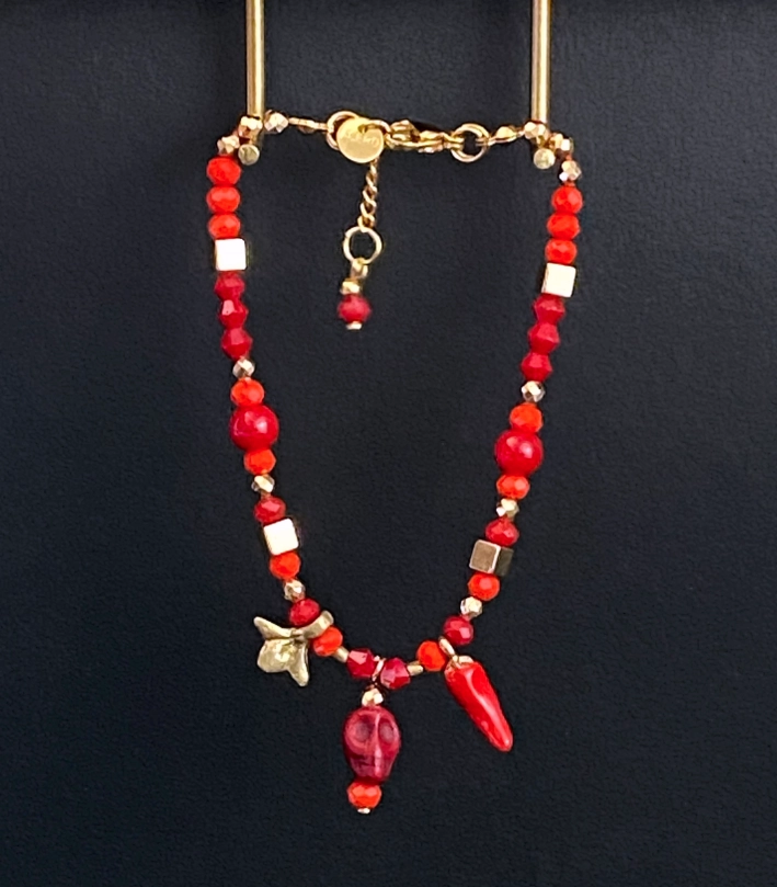 El detalle central en forma de calavera roja se complementa con un charm de chile picante y flor metálica en tono dorado, creando un contraste audaz y llamativo.