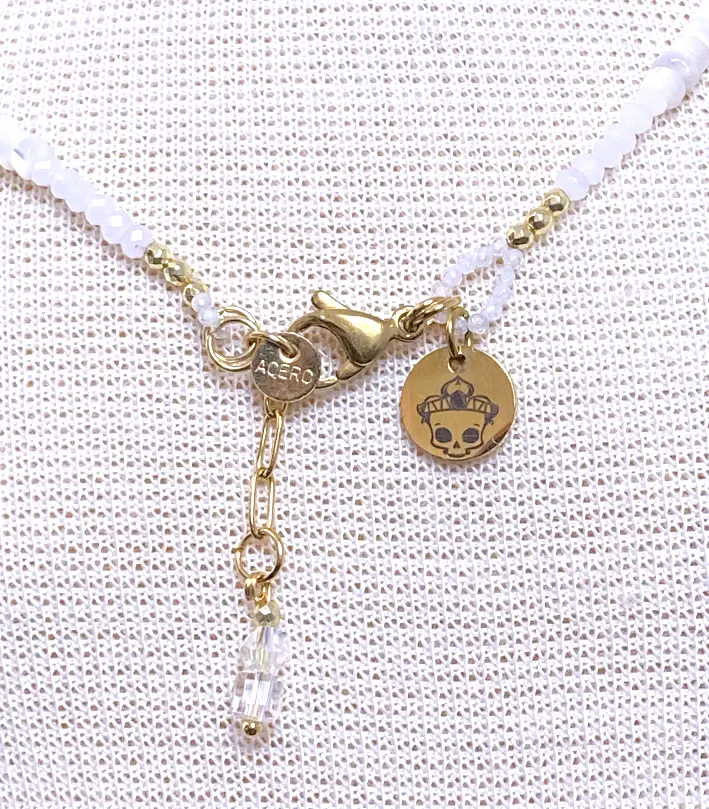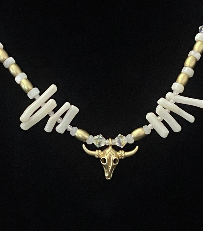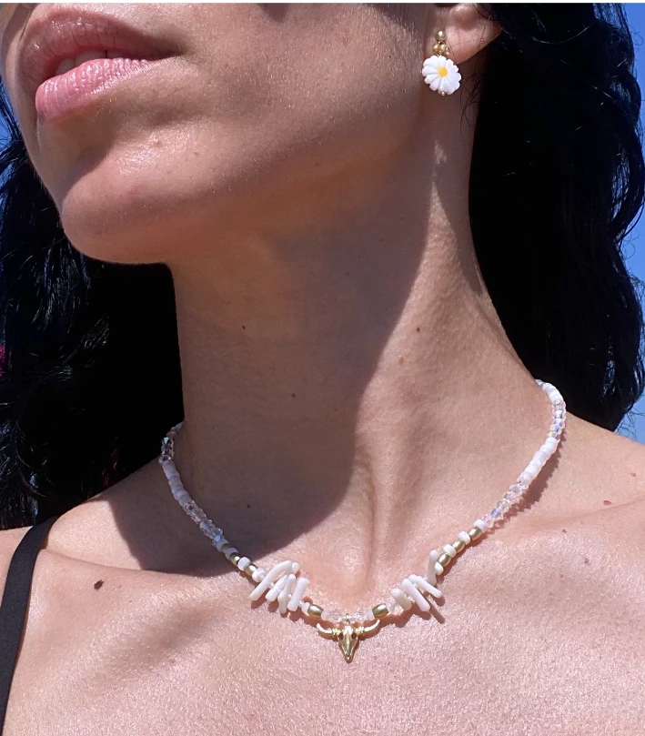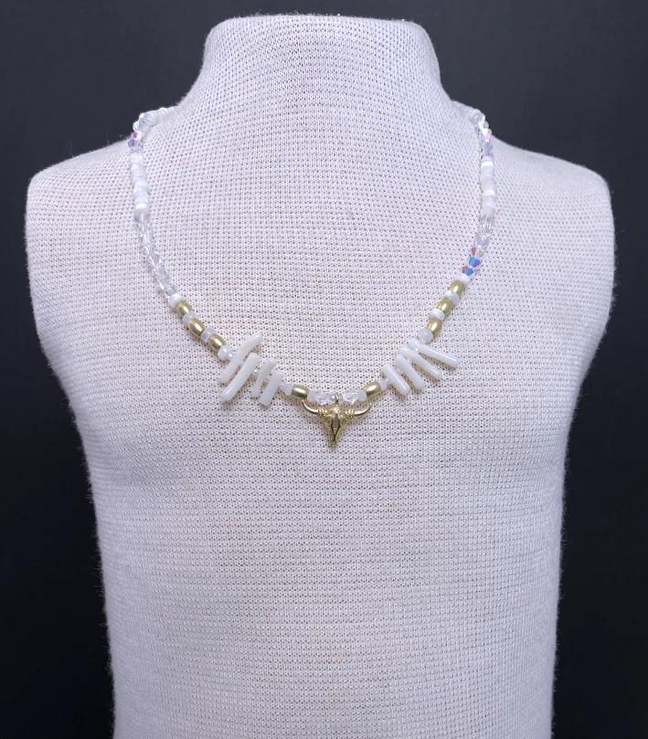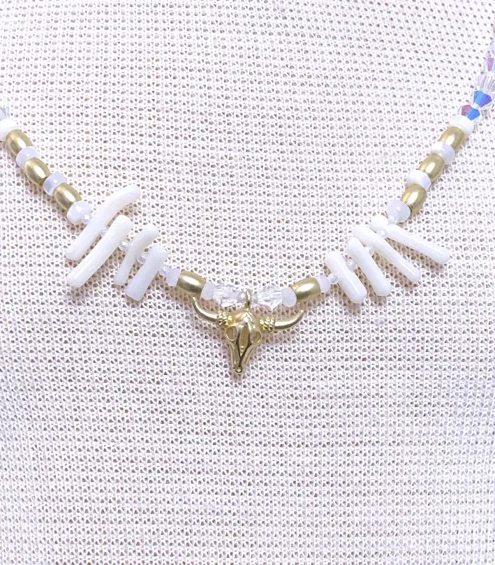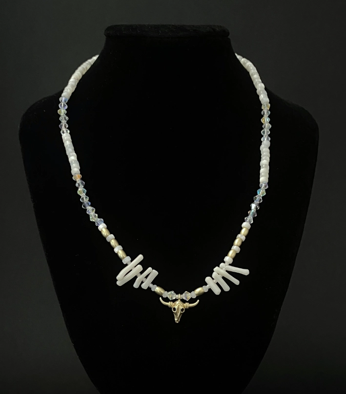 El Set Collar Artesanal Salvaje y Elegante Oeste de Princesa de Roca Negra fusiona el espíritu libre del oeste con un toque sofisticado. Su diseño combina cuentas blancas y nacaradas con detalles brillantes en cristal, mientras que el dije central en forma de calavera de toro dorada añade un carácter fuerte y atrevido.