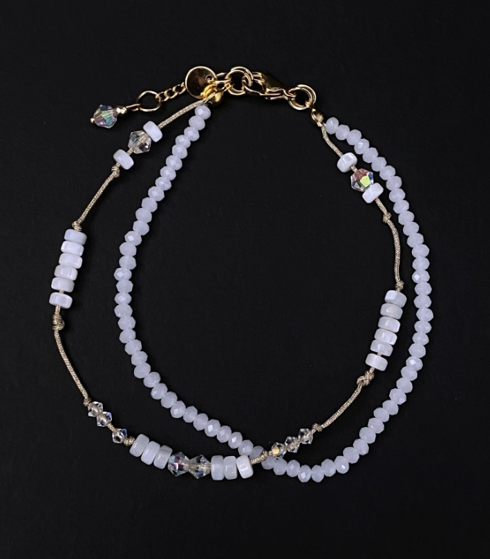 Detalles en cristales facetados que aportan brillo y cuentas doradas dan toque elegante